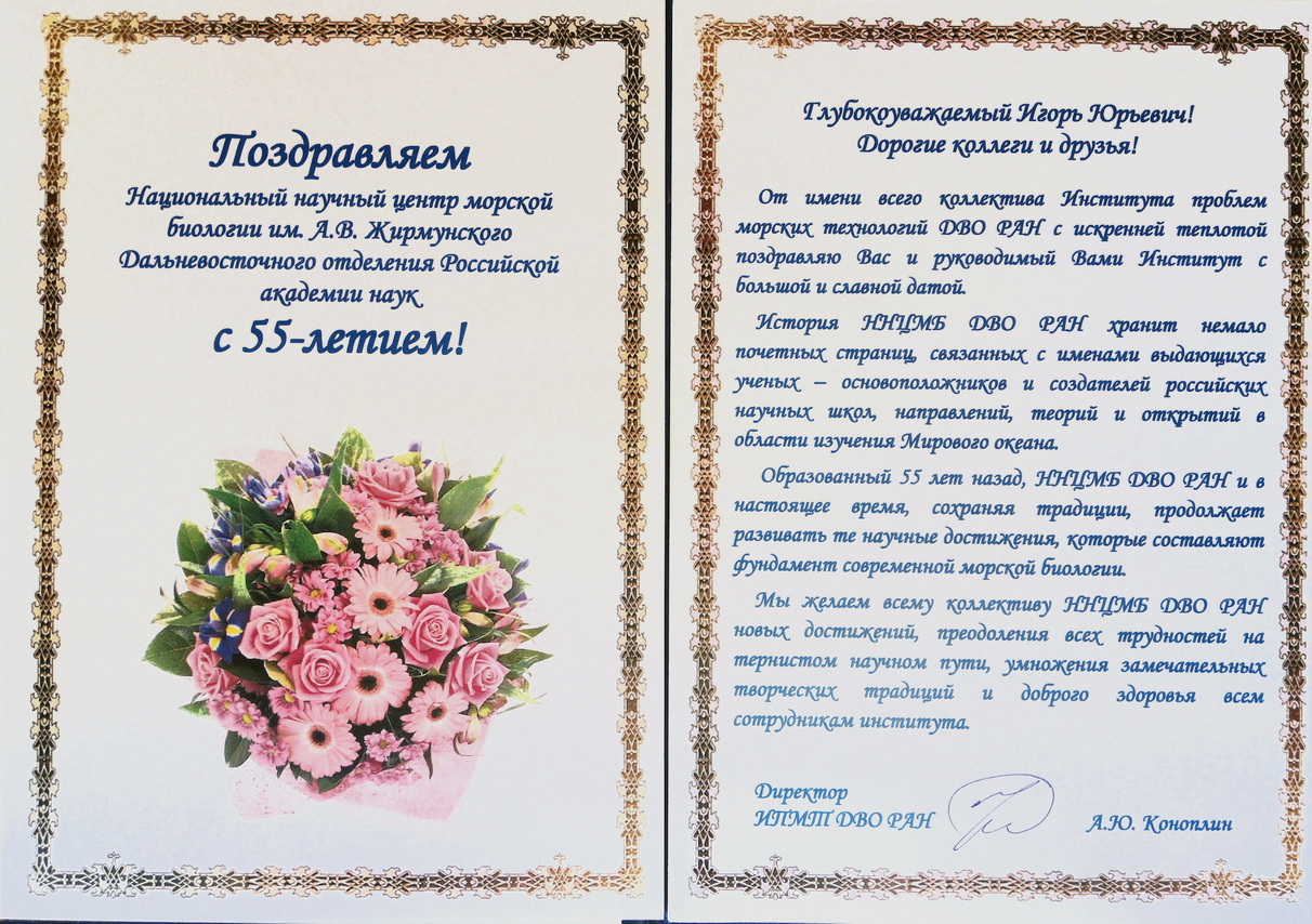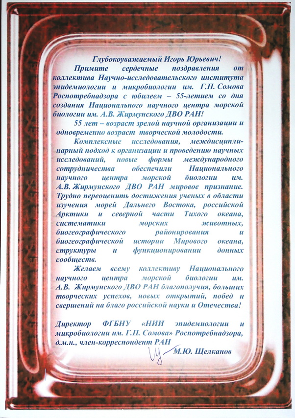 Завершили Торжественное собрание поздравлением академика РАН Владимира Васильевича Малахова, работавшего в Институте биологии моря ДВО РАН в период 1982-1985 г.г., автора и соавтора многочисленных научных публикаций с учёными ННЦМБ ДВО РАН, Учителя академика РАН А.В. Адрианова: «Дорогие коллеги, Поздравляю вас с 55-летним юбилеем нашего Института биологии моря, ныне Национального научного центра морской биологии имени А.В. Жирмунского. Прошу передать коллективу Института поздравления и от меня, и от всей нашей кафедры — кафедры зоологии беспозвоночных МГУ. Жизнь идет вперед, все меняется, но как огромный маяк светит центр российской морской биологической науки на наших богатейших Дальневосточных морях. Свет этот привлекает научные силы со всей России, свет этот доходит до самых дальних уголков нашей планеты, его знают и видят морские биологи во всем мире. Пусть же этот свет не гаснет никогда! Институт биологии моря сыграл важную роль в моей жизни, может быть, самую главную роль. В стенах Института я нашел свое личное счастье, Институт принял моих лучших учеников, которые сделали в его стенах выдающуюся научную карьеру, наша кафедра по-прежнему активно сотрудничает с Институтом биологии моря. Страшно представить, но я впервые побывал в Институте в 1971 г. Немного осталось на земле тех, кто помнит Институт того времени и «Восток» того времени. В этот день, день 55-летнего юбилея, вспомним тех, кто отдал свои силы Институту биологии моря. Здоровья и сил живым и вечная память ушедшим. Дорогие ИБМ-вцы, в день праздника вспомните Владимира Васильевича Малахова и Любу Медведеву, старшее поколение нас помнит, а мы вас не забываем никогда. С пожеланиями развития и процветания, Ваш Малахов».