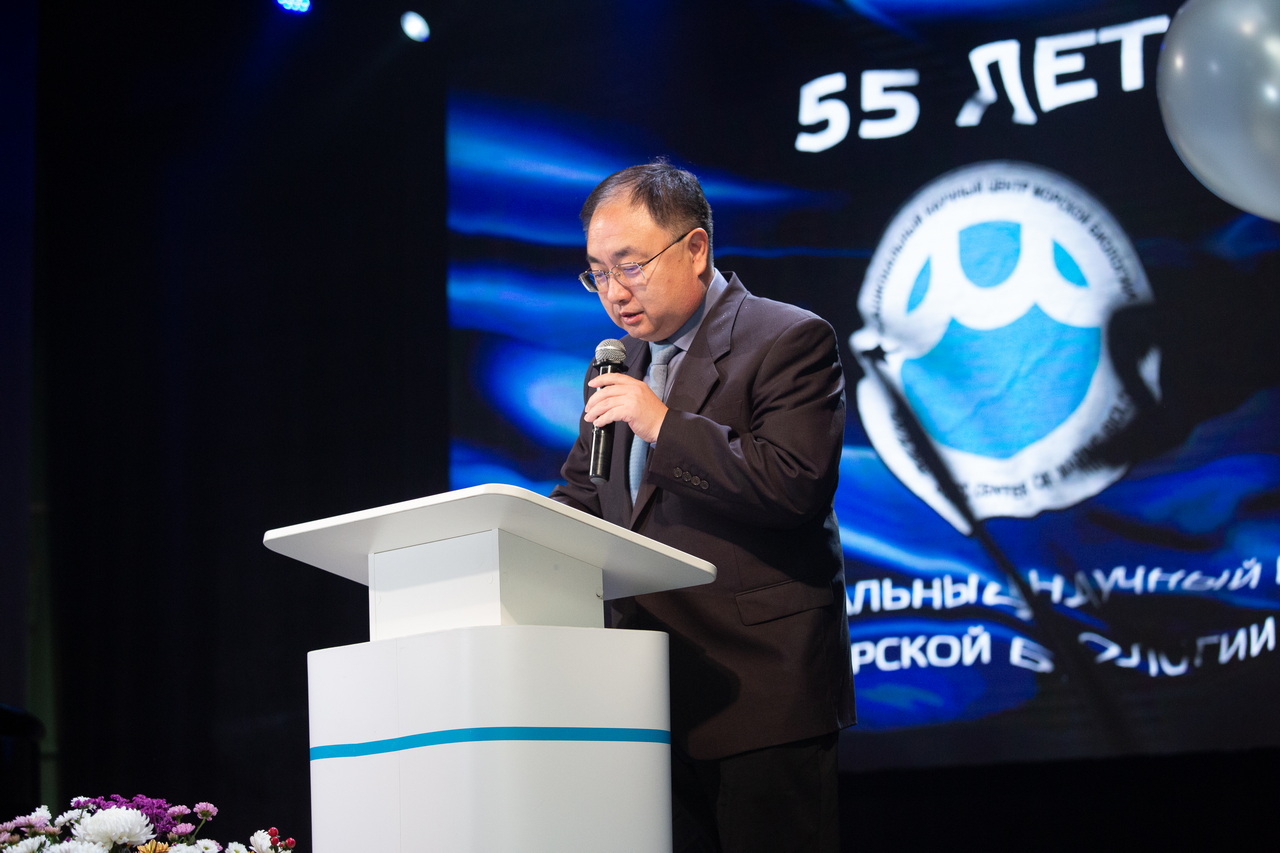Коллектив ННЦМБ ДВО РАН далее поздравил руководитель Тихоокеанского филиала ГНЦ РФ ФГБНУ «ВНИРО» («ТИНРО») Алексей Байталюк. Алексей Анатольевич вручил поздравительные адресы от Директора и коллектива ГНЦ РФ ФГБНУ «ВНИРО», отметил в своем выступлении, что в эти сентябрьские дни отмечается и 100-летний юбилей ТИНРО, и подчеркнул - наши ученые 55 лет вместе! Алексей Анатольевич рассказал о тесной связи ученых-прикладников и ученых академической науки. Обращаясь к директору ННЦМБ ДВО РАН чл.-корр. РАН Игорю Долматову, и ко всему коллективу Научного центра, он подчеркнул: «Научно-производственная деятельность ННЦМБ ДВО РАН ‒ это важная часть истории развития науки на Дальнем Востоке России. Создание в 1970 году Института биологии моря ДВО РАН расширило возможности отечественных комплексных исследований дальневосточных морей и Тихого океана, объединённых общей целью ‒ обеспечить экономическое развитие Дальнего Востока». А.А. Байталюк выразил уверенность в сохранении добрых традиций взаимодействия и дальнейшем успешном сотрудничестве, а коллегам из ННЦМБ ДВО РАН пожелал крепкого здоровья, благополучия, дальнейших успехов в фундаментальных, поисковых и прикладных научных исследованиях в области морской биологии, биотехнологии и смежных наук, бодрости духа и новых славных юбилеев! «Я бы хотел вручить вам настенную плакетку, где написано первое слово – ДРУЗЬЯМ!», - завершил свое выступление А.А. Байталюк.