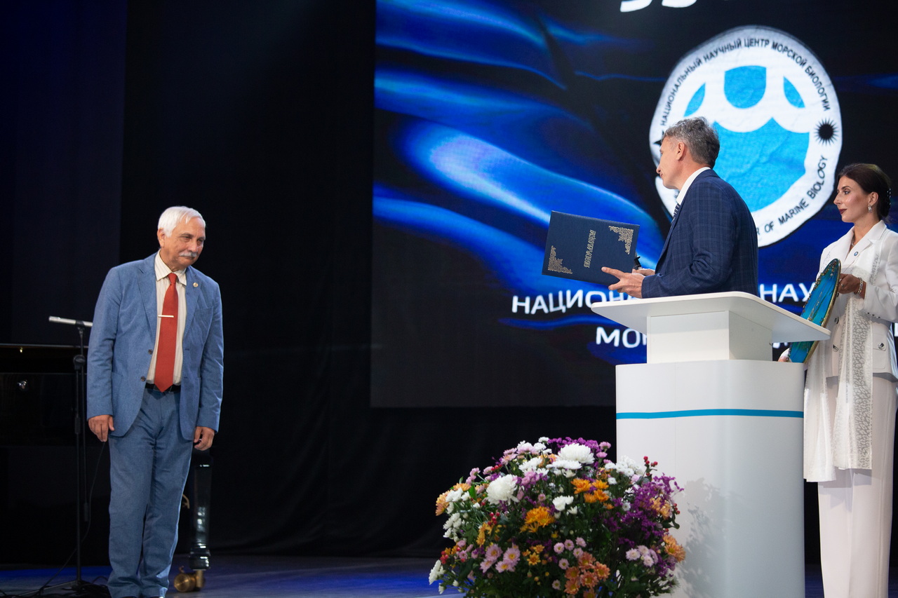 От Дальневосточного отделения РАН слова поздравления прозвучали от академика РАН Валентина Ивановича Сергиенко и главного ученого секретаря ДВО РАН академика РАН Виктора Всеволодовича Богатова. Валентин Иванович Сергиенко остановился на основных вехах истории научного Центра. С момента организации Отдела биологии моря, а затем создания 1 января 1970 года Института биологии моря в составе Дальневосточного научного центра АН СССР прошло всего чуть более полувека. Валентин Иванович выразил слова благодарности ветеранам и всем сотрудникам за тактичное и бережное отношение к истории Института к памяти тех, кто дал ему жизнь и сформировал его нынешний, узнаваемый в научном мире облик. Отметив вклад директоров Института, от Алексея Викторовича Жирмунского, которого хорошо знал лично, Валентин Иванович отметил преемственность поколений в смене последующих директоров. Выступающий отметил высокий профессионализм, многолетний плодотворный труд и большой вклад ученых Центра в развитие фундаментальной академической науки на Дальнем Востоке. Институт всегда развивался постоянно вместе со страной и остро ощущал на себе все те изменения, которые происходили вокруг. После реорганизации ИБМ ДВО РАН в Национальный научный центр морской биологии, включающий научно-образовательный комплекс «Приморский океанариум», он стал признанным ведущим научным учреждением в области морской биологии. Одним из первых еще в середине 2000-х Институт начал глубоководные исследования, и с тех пор каждый год проводятся крупные экспедиции. Направления, которые развиваются в Центре, уникальны, и, безусловно, по уровню проводимых работ это учреждение мирового уровня. В настоящее время крупнейший научный Центр находится под научно‑методическим руководством Дальневосточного отделения РАН. Валентин Иванович пожелал собравшемуся коллективу дальнейшего процветания, дружной и слаженной работы по всем направлениям деятельности.