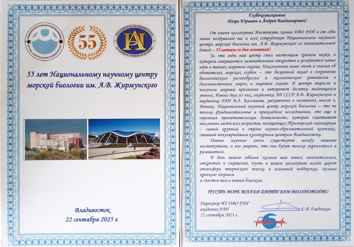 Андрей Владимирович также зачитал поздравление от Отделения биологических наук Российской академии наук, где отмечено, что Институт биологии моря прошел славный путь становления и развития, оставив яркий след в истории отечественной науки, а его преемник – в настоящее время Национальный научный центр морской биологии им. А.В. Жирмунского ДВО РАН, взял очень высокую планку и с честью держит её. Достижения учёных позволяют утверждать, что Национальный научный центр морской биологии им. А.В. Жирмунского вносит важный вклад в развитие науки в Дальневосточном регионе и России. Наши коллеги из ОБН РАН пожелали коллективу плодотворной работы и больших успехов в достижении новых высот в развитии науки.