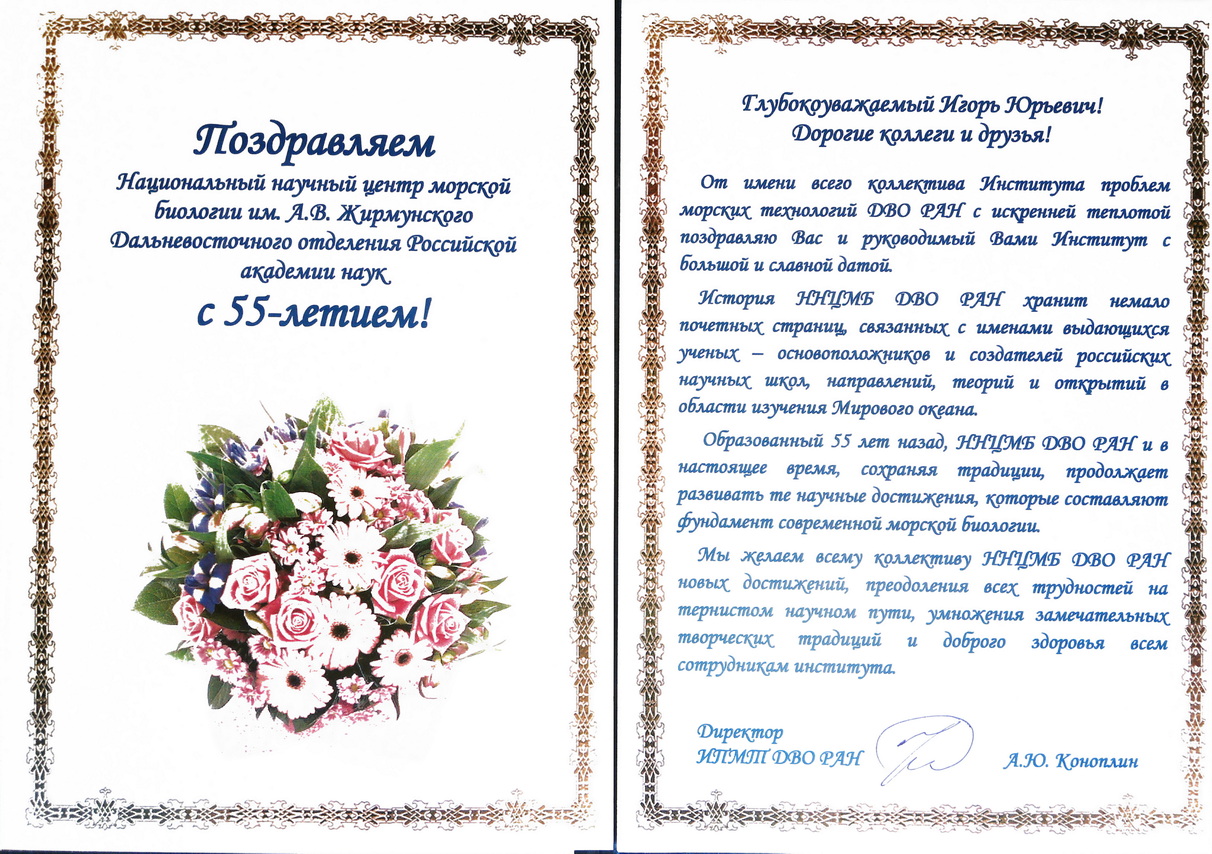 Завершили Торжественное собрание поздравлением академика РАН Владимира Васильевича Малахова, работавшего в Институте биологии моря ДВО РАН в период 1982-1985 г.г., автора и соавтора многочисленных научных публикаций с учёными ННЦМБ ДВО РАН, Учителя академика РАН А.В. Адрианова: «Дорогие коллеги, Поздравляю вас с 55-летним юбилеем нашего Института биологии моря, ныне Национального научного центра морской биологии имени А.В. Жирмунского. Прошу передать коллективу Института поздравления и от меня, и от всей нашей кафедры — кафедры зоологии беспозвоночных МГУ. Жизнь идет вперед, все меняется, но как огромный маяк светит центр российской морской биологической науки на наших богатейших Дальневосточных морях. Свет этот привлекает научные силы со всей России, свет этот доходит до самых дальних уголков нашей планеты, его знают и видят морские биологи во всем мире. Пусть же этот свет не гаснет никогда! Институт биологии моря сыграл важную роль в моей жизни, может быть, самую главную роль. В стенах Института я нашел свое личное счастье, Институт принял моих лучших учеников, которые сделали в его стенах выдающуюся научную карьеру, наша кафедра по-прежнему активно сотрудничает с Институтом биологии моря. Страшно представить, но я впервые побывал в Институте в 1971 г. Немного осталось на земле тех, кто помнит Институт того времени и «Восток» того времени. В этот день, день 55-летнего юбилея, вспомним тех, кто отдал свои силы Институту биологии моря. Здоровья и сил живым и вечная память ушедшим. Дорогие ИБМ-вцы, в день праздника вспомните Владимира Васильевича Малахова и Любу Медведеву, старшее поколение нас помнит, а мы вас не забываем никогда. С пожеланиями развития и процветания, Ваш Малахов».
